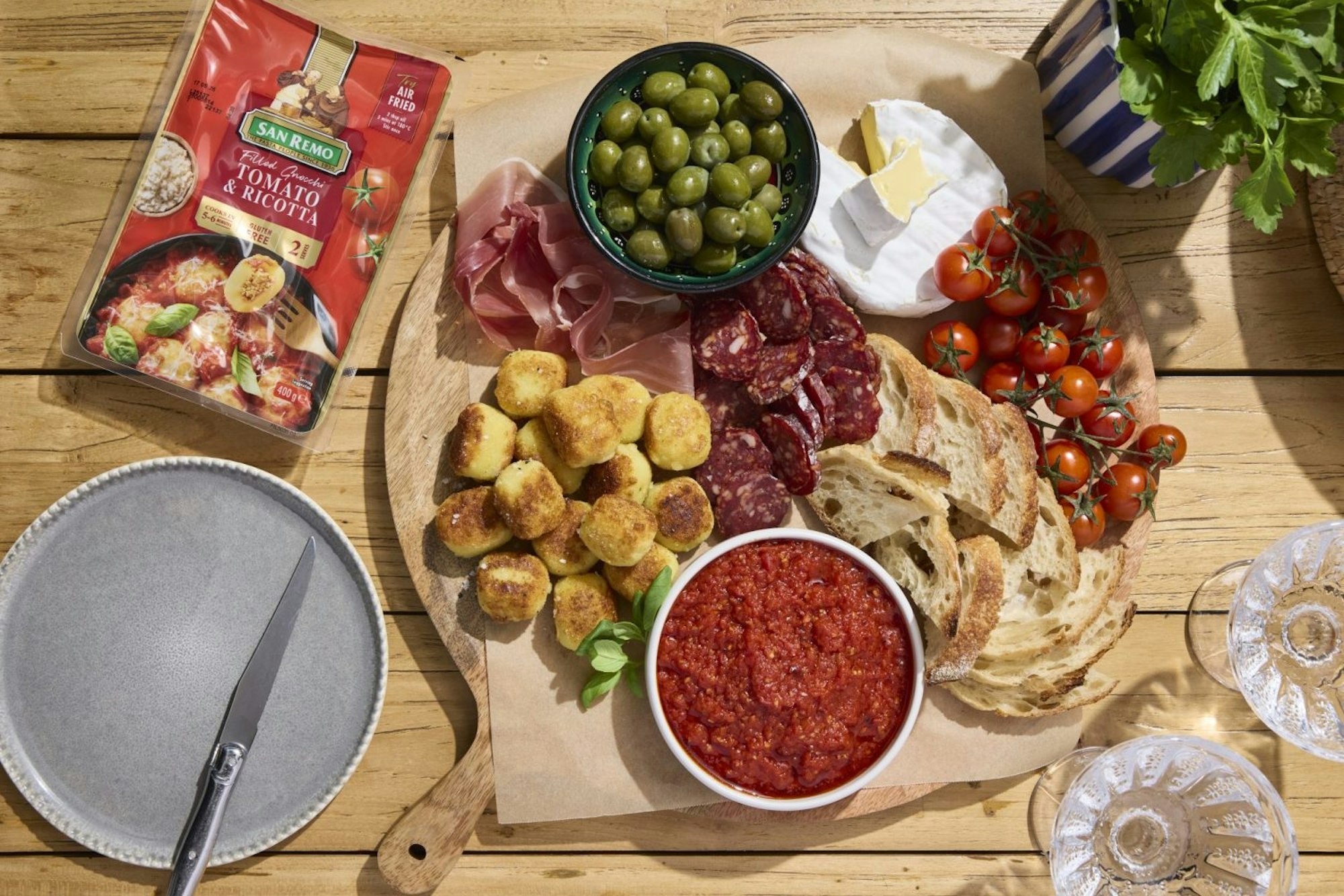 3. Serve the crispy gnocchi in a bowl with the warm spicy marinara dip on the side, alongside an antipasto platter and bread or grissini.